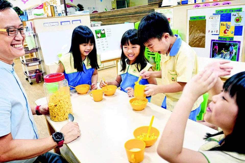 அங் மோ கியோவில் இருக்கும் 'கார்ப்பி டியம் @ ஐடிஇ' பாலர் பள்ளியில் 'கே2' பயிலும் மாணவர்களுக்கு உணவளித்து உரையாடும் நிலைய மேலாளர் லோர்பெர்ட் டே (இடது).