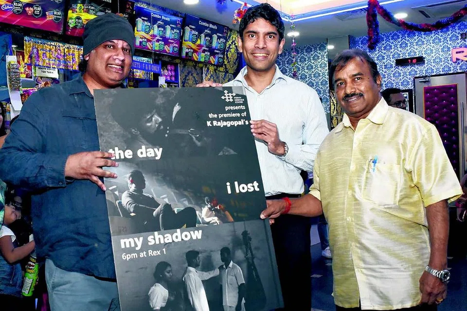 ரெக்ஸ் திரையரங்கில் குறும்படங்கள் வெளியிடப்பட்டபோது இயக்குநர் ராஜகோபாலுடன் நாடாளுமன்ற உறுப்பினர் திரு. விக்ரம் நாயரும் திரையரங்கின் உரிமையாளர் நாராயணசாமியும். படம்: இந்திய மரபுடைமை நிலையம்