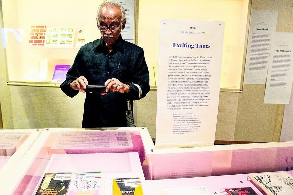 'டாக்டர் சுந்தர்' நாடகத்தை எழுதிய சிங்கப்பூரின் மூத்த நாடகக் கலைஞர்களில் ஒருவரான திரு எஸ் வரதன் தேசிய நூலக வாரியக் கட்டடத்தில் நடைபெறும் கண்காட்சியைப் பார்வையிடுகிறார். இந்தக் கண்காட்சியில் பல ஆண்டுகால நாடக எழுத்து வடிவங்கள் இடம்பெற்றுள்ளன. படம்: தேசிய நூலக வாரியம்