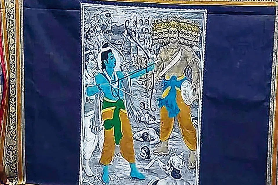 பத்து தலைகளுடனான ராவணனை ராமன் வதம் செய்யும் காட்சி, போர்க்களக் காட்சிகளை ஒன்பது வண்ணங்களில் அவர் காட்சிப்படுத்தி உள்ளார்.