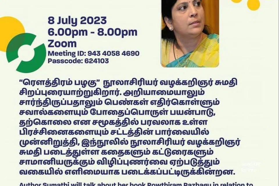 ஒரு வழக்கறிஞராக அவர் சந்தித்தவர்களின் பிரச்சினைகளை ஆராய்ந்து கட்டுரைகளாக எழுதி ரௌத்திரம் பழகு என்ற தலைப்பில் நூலை வெளியிட்டுள்ள திருவாட்டி சுமதி கடந்த சனிக்கிழமை அன்று சிறப்புரை ஒன்றை ஆற்றினார்.