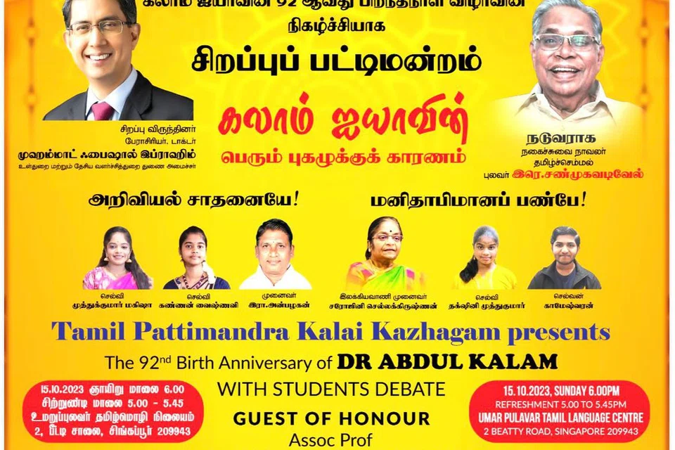 டாக்டர் அப்துல் கலாம் அவர்களின் 92வது பிறந்தநாளைப் போற்றும் நிகழ்வாக சிங்கப்பூர்த் தமிழ்ப் பட்டிமன்றக் கலைக் கழகம், சிறப்புப் பட்டிமன்றம் ஒன்றை ஏற்பாடு செய்திருக்கிறது.