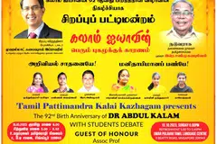 இந்தியாவின் முன்னாள் அதிபரும் தலைசிறந்த அறிவியல் வல்லுநருமான டாக்டர் அப்துல் கலாமின் 92வது பிறந்தநாளையொட்டி, இம்மாதம் 15ஆம் தேதி ஞாயிறு மாலை, தமிழ்ப் பட்டிமன்றக் கலைக் கழகம் சிறப்புப் பட்டிமன்றத்திற்கு ஏற்பாடு செய்திருந்தது.