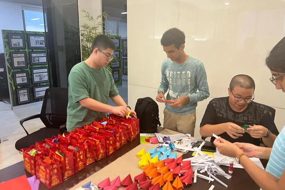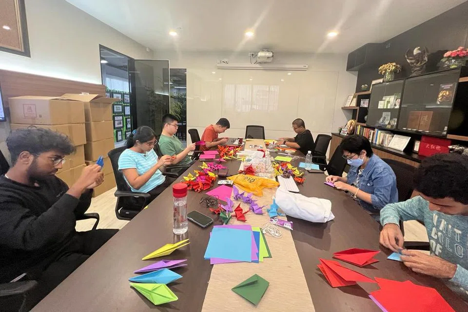 ஒரிகாமியைச் செய்யவும் அன்பளிப்புப் பைகளைத் தயாரிக்கவும் தொண்டூழியர்கள் வெள்ளிக்கிழமையன்று ஒன்றுகூடியிருந்தனர்.