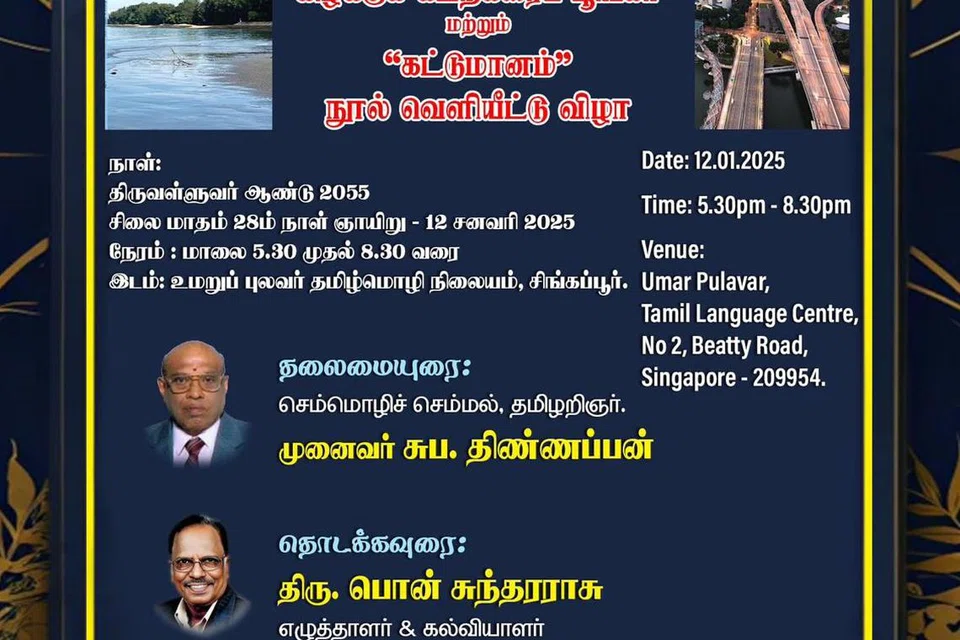 உமறுப்புலவர் தமிழ் மொழி நிலையத்தில் வரும் ஞாயிற்றுக்கிழமை (ஜனவரி 12) மாலை மணி 5.30 முதல் 8.30 வரை இடம்பெறும் நிகழ்ச்சியில் க.நெடுஞ்செழியன் எழுதிய ‘கிழக்குக் கடற்கரைப் பூங்கா’, ‘கட்டுமானம்’ என்ற இரு நூல்கள் வெளியிடப்படவுள்ளன. தமிழறிஞர் முனைவர் சுப. திண்ணப்பன் நிகழ்ச்சிக்குத் தலைமை தாங்கவுள்ளார். கல்வியாளரும் எழுத்தாளருமான பொன். சுந்தரராசு தொடக்கவுரை ஆற்றுவார். தமிழறிஞரும் வழக்கறிஞருமான த. இராமலிங்கம் சிறப்பு விருந்தினராகக் கலந்துகொள்கிறார். இந்நிகழ்ச்சிக்கு அண்ணாமலைப் பல்கலைக்கழக முன்னாள் மாணவர்கள் சங்கம் (சிங்கப்பூர்) ஏற்பாடு செய்துள்ளது. தொடர்புக்கு: ம.கருணாநிதி - 92386749, க.நெடுஞ்செழியன் - 92398494