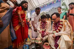 இந்தியப் பாரம்பரிய உடைகளை அணிந்த சீன ஏற்பாட்டுக் குழுவினரும் அவருடன் இணைந்து முந்திரி, நெய், திராட்சை போன்றவற்றைச் சேர்த்தனர்.