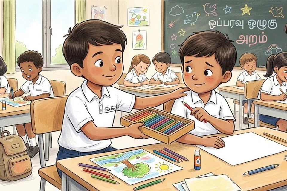 “மாணவர்களே, தன்னிடம் பென்சில் இல்லாததால் வருத்தப்பட்ட நண்பனுக்கு, முகிலன் தன்னிடம் இருந்ததைப் பகிர்ந்து கொடுத்து உதவினான். இதையே ஔவை பாட்டி தனது ஆத்திசூடியில் ‘ஒப்புரவு ஒழுகு’ என்று கூறியுள்ளார்,” என்று விளக்கினார்.