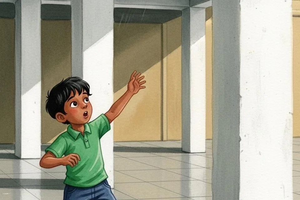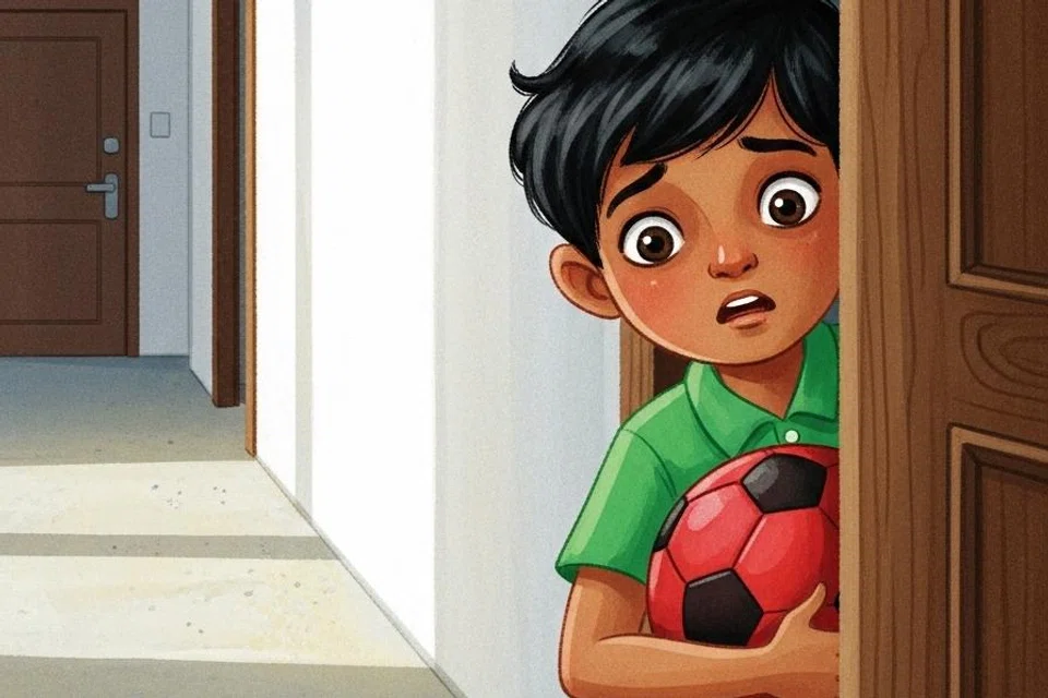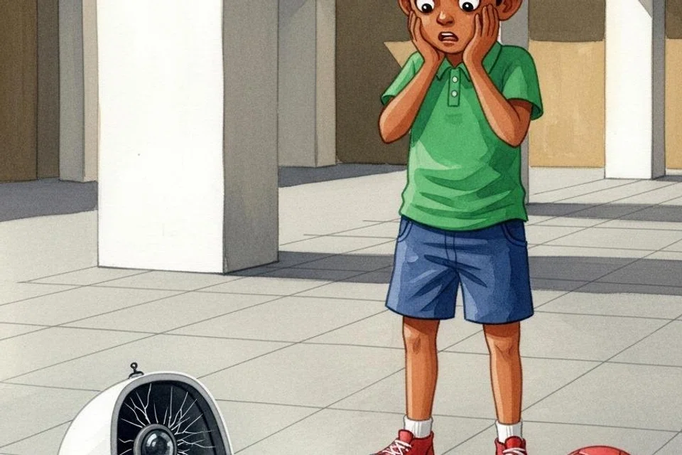 திடீரென்று அவன் பந்தை ஓங்கி உதைக்க, அது உயரே இருந்த ஒரு கண்காணிப்புப் படக்கருவியின் (CCTV) மீது பலமாகப் பட்டது. “டக்!” என்ற சத்தத்துடன் படக்கருவி கீழே விழுந்து உடைந்தது. கவின் அதைப் பார்த்து அதிர்ச்சியில் அப்படியே நின்றுவிட்டான். அவனது இதயம் வேகமாகத் துடித்தது. பயத்தில் கவின் பந்தை எடுத்துக்கொண்டு மின்தூக்கி மூலம் தன் வீட்டிற்கு ஓடினான்.