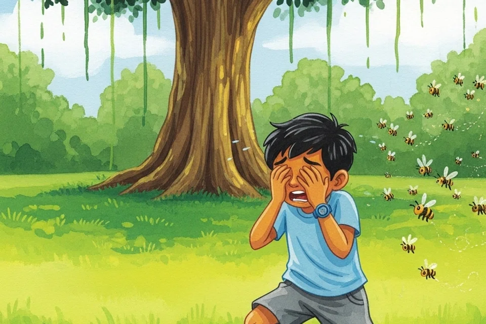 ஆனால், அதனைக்க் காதில் வாங்கிக்கொள்ளாத விக்ரம், ஒரு கல்லை குறிபார்த்து வீசினான். தேன்கூடு கீழே விழுந்தது. அதைப் பார்த்த கவின், இப்போது என்ன நடக்குமோ என பயந்தான். கூட்டை நோக்கி வந்த தேனீக்கள் கூடு கீழே விழுந்து கிடப்பதைப் பார்த்து கோபம் கொண்டன. அவை சிறுவர்களைத் துரத்தத் தொடங்கின. கவின் என்ன செய்வது என்று தெரியாமல் பயத்தில் உறைந்து போனான்.
