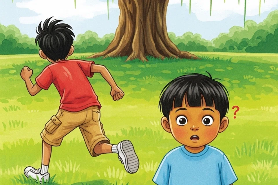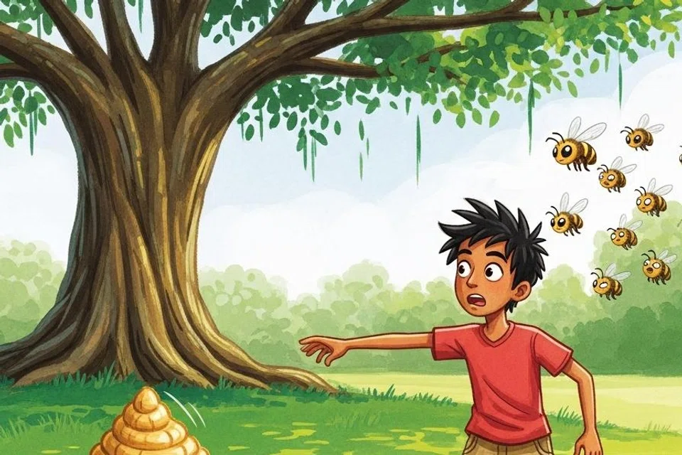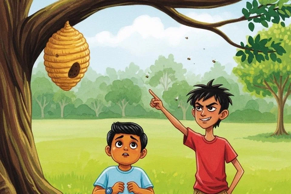 “சிறுவனே! அந்த மரத்தில் பார்! ஒரு பெரிய தேன் கூடு இருக்கிறது. நான் அதன்மீது கல்லை வீசி கீழே விழ வைக்கப்போகிறேன். கீழே விழுந்ததும் உனக்கும் தேன் தருகிறேன்,” என்று கூறினான் விக்ரம். “தேன் கூட்டைக் கலைத்தால் தேனீக்கள் நம்மைக் கடித்துவிடும். அதனால் வேண்டாம்,” என்று பயத்துடன் கூறினான் கவின்.