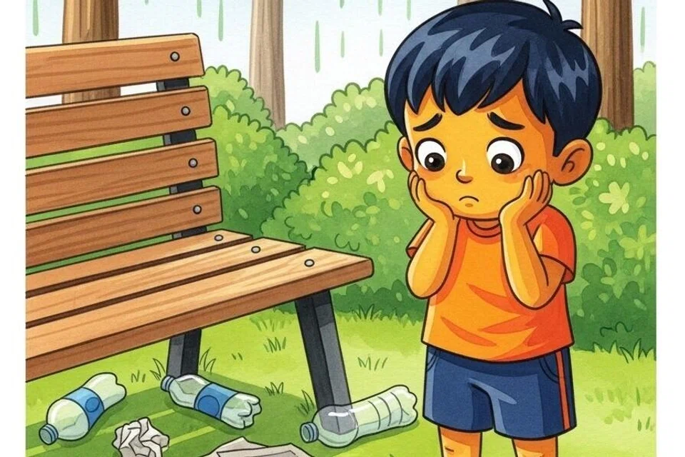 பள்ளி விடுமுறை வந்தது. கண்ணன் விளையாடப் பூங்காவிற்குச் சென்றான். அங்கே அவனுக்கு ஒரு பெரிய அதிர்ச்சி! பூங்கா முழுவதும் நிறைய குப்பைகள் கிடந்தன. புற்களுக்கு நடுவே பிளாஸ்டிக் பாட்டில்களும் காகிதங்களும் சிதறிக் கிடந்தன.