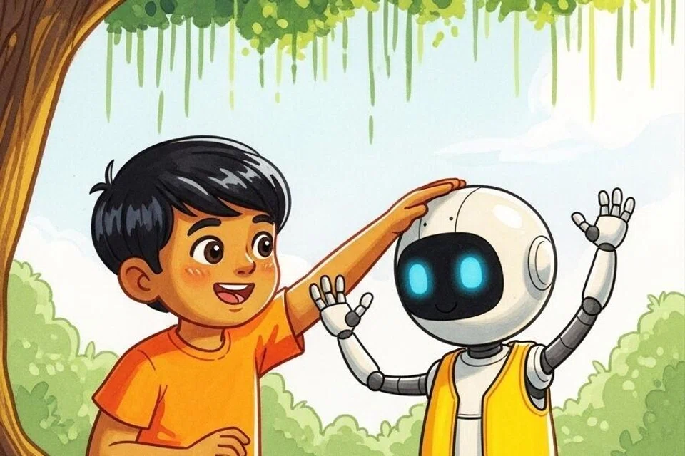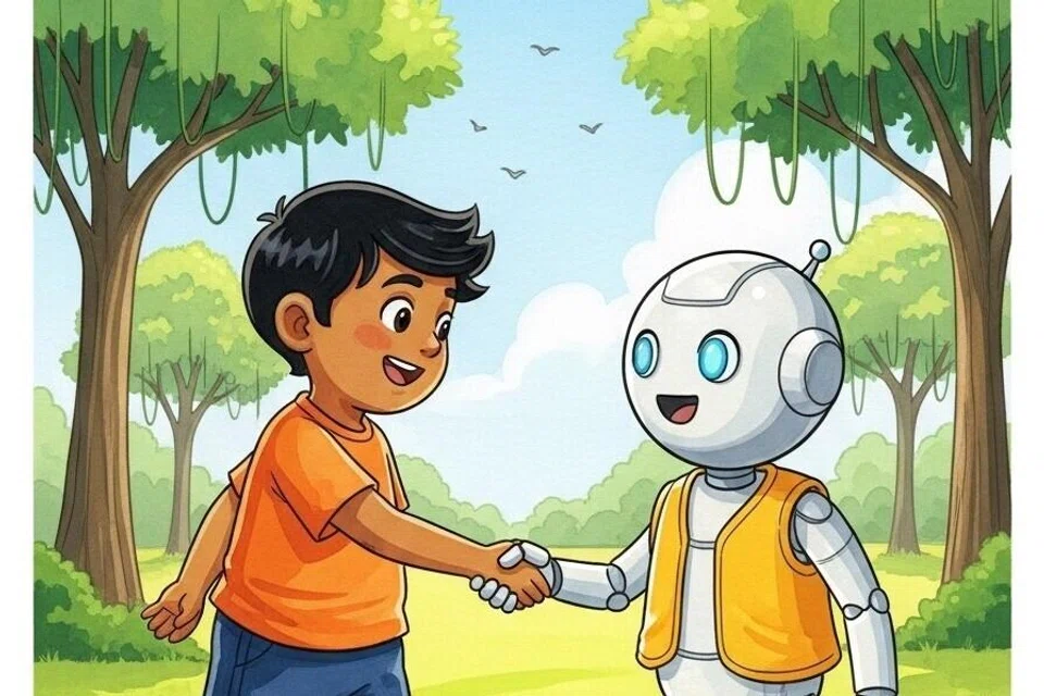 அதன் கண்கள் நீல நிறத்தில் அழகாக மின்னின. கண்ணன் அதை ஆச்சரியமாகப் பார்த்தான். “நீ யார்?” என்று கண்ணன் கேட்டான். அந்த ரோபோ தலையை ஆட்டி ஒரு இனிய சத்தம் போட்டது.