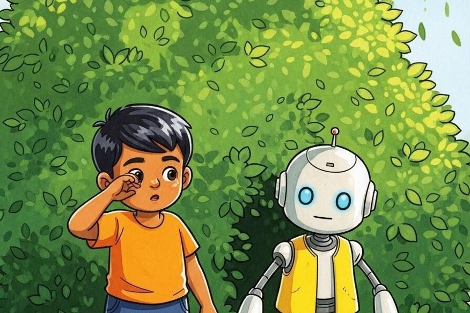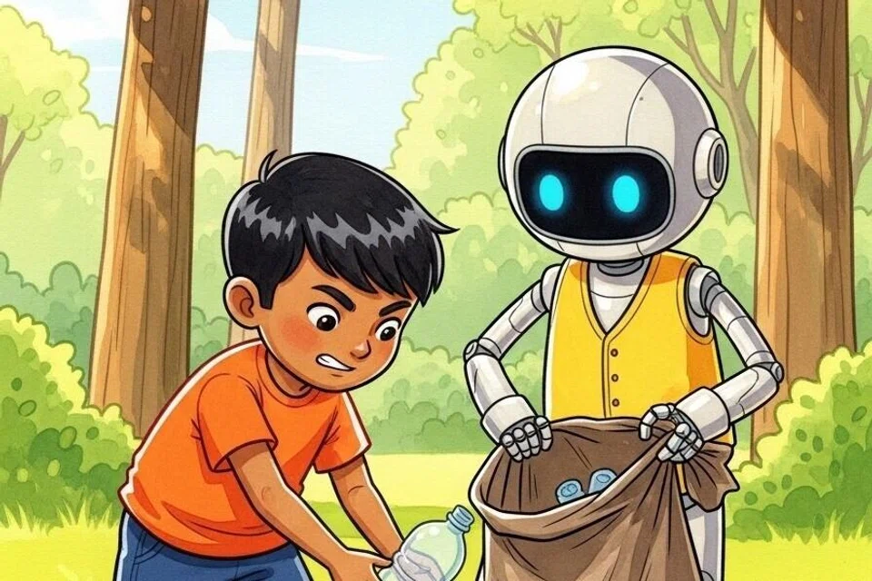 “ஐயோ! பூங்கா எவ்வளவு அசுத்தமாக இருக்கிறது!” என்று கண்ணன் வருத்தப்பட்டான். அப்போது, திடீரென்று “டிக்... டிக்...” என்று ஒரு சத்தம் கேட்டது. ஒரு புதருக்குப் பின்னால் இருந்து சிறிய ரோபோ ஒன்று வெளியே வந்தது.