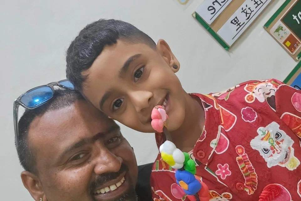 ஐந்து வயது சைலேஷ், தாம் செய்திருந்தக் கைவினைப் பொருளைக் கையில் பிடித்துகொண்டு தந்தையுடனு படமெடுக்கிறார். - படம்: கவிகுமார் பிரேம்குமார்