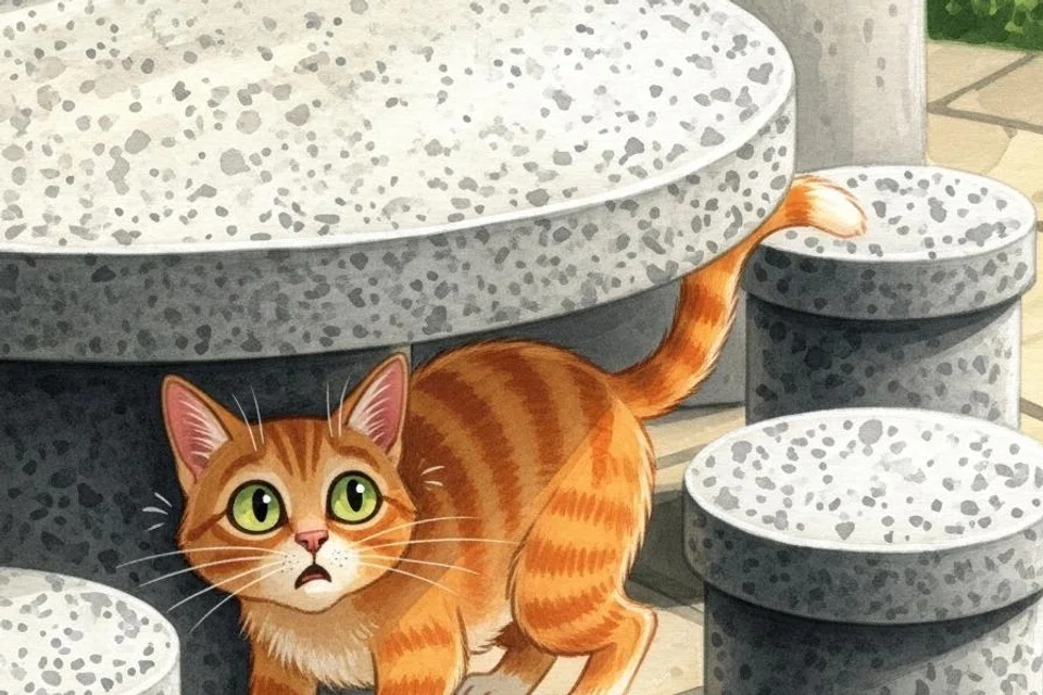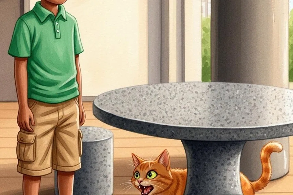 திடீரென்று விசித்திரமாக சீறும் சத்தம் கேட்டது. கபிலன் உடனே நின்று கவனமாகக் கேட்டான். அந்தச் சத்தம் ஒரு தூணின் பின்னால் இருந்த கல் மேசைக்கு அடியில் இருந்து வந்தது. அருகில் சென்று பார்த்தபோது ஒரு சிறிய பூனை பதுங்கியிருந்ததைக் கண்டான் கபிலன்.