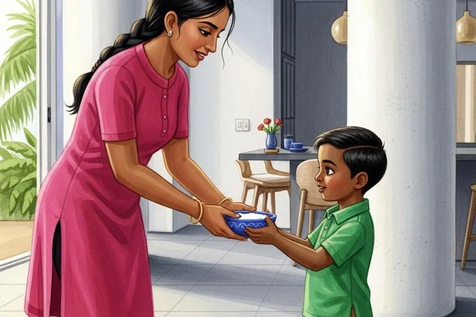 முதலில் தயங்கிய பூனை, கபிலனின் அமைதியையும் அன்பையும் பார்த்து மெதுவாக வந்து சாப்பிட்டது. பசி தீர்ந்ததும், அந்தப் பூனை கபிலனை நோக்கி வந்தது. அது தன் தலையை கபிலனின் காலில் மென்மையாக உரசி, ‘மியாவ்’ என்று செல்லமாகச் சத்தம் போட்டது. மணியின் பயம் முற்றிலும் மறைந்துவிட்டது.