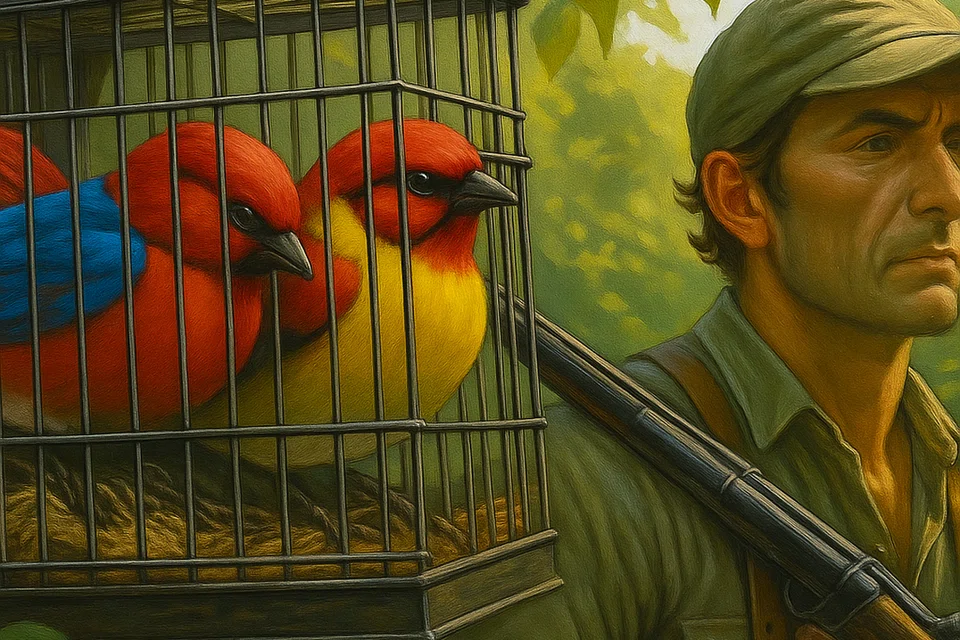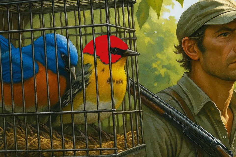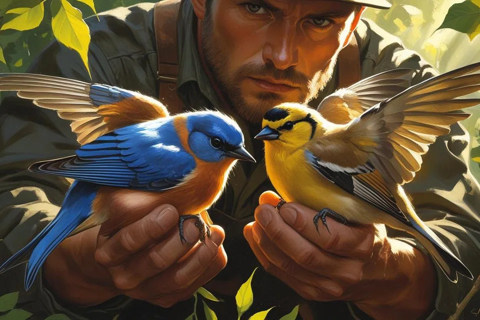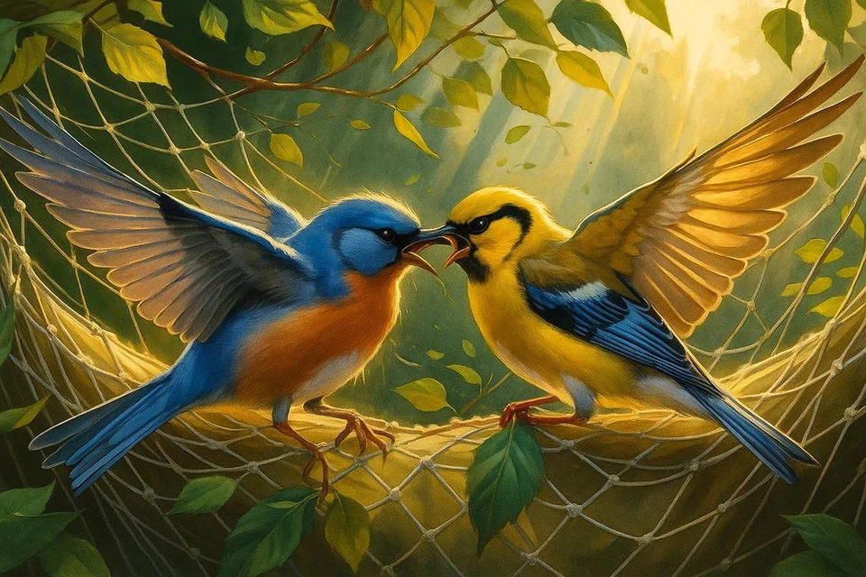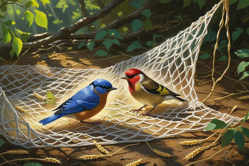 வேடன் விரித்த வலை என்று அறியாத இரண்டு சிட்டுக்குருவிகளும் தானியங்களை உண்ண கீழே வந்தன. அவற்றின் கால்கள் வலையில் சிக்கிக்கொண்டன. அப்போதுதான் தாங்கள் வலையில் மாட்டிக்கொண்டதை உணர்ந்தன. ஆராய்ந்து பார்க்காமல் வேடன் விரித்த வலையில் மாட்டிக்கொண்டதை நினைத்து வருந்தின. தூரத்தில் வேடன் வருவதைப் பார்த்ததும் இந்த ஆபத்திலிருந்து எவ்வாறு தப்பிப்பது என்று இரண்டும் யோசிக்கத் தொடங்கின.