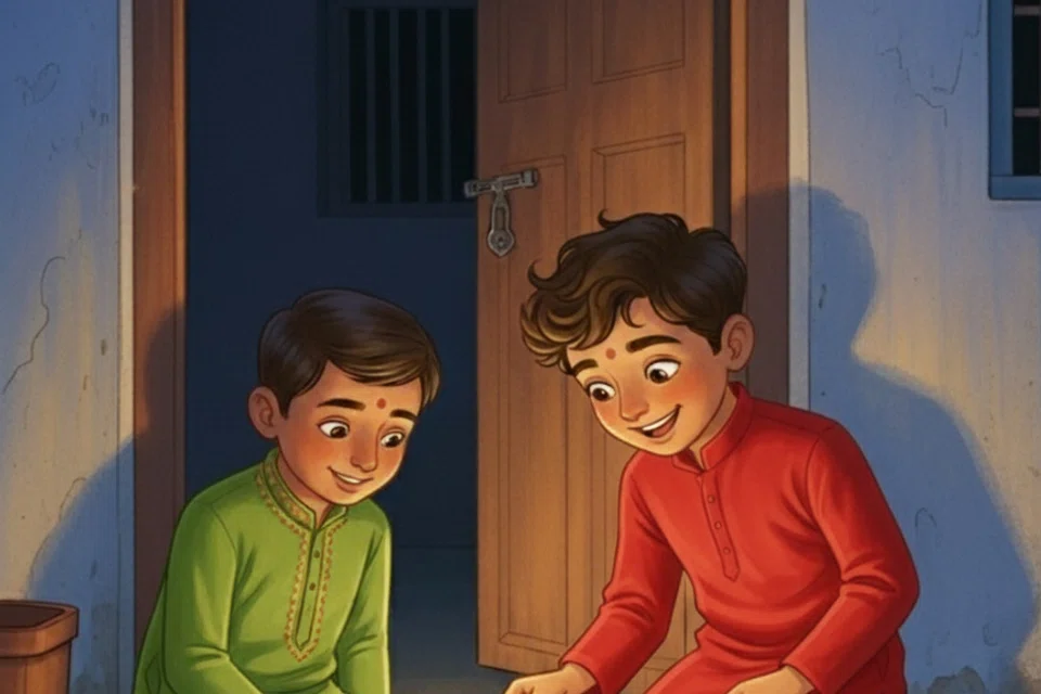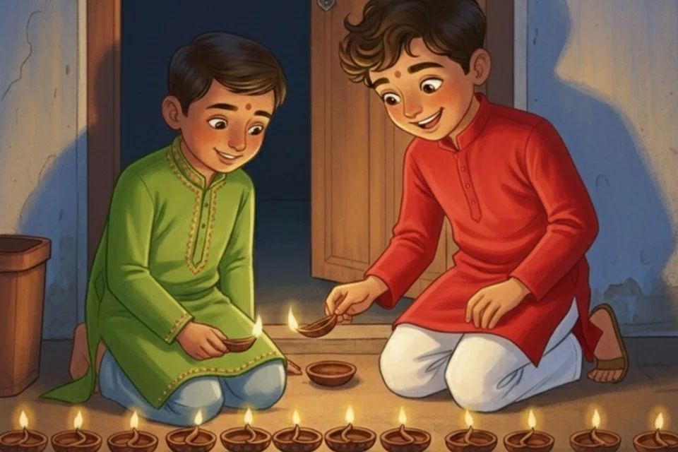 தீபாவளியன்று நண்பர்கள் புத்தாடை உடுத்தி வீட்டு வாசல்களில் விளக்கேற்றி தீபாவளியைக் கொண்டாடினார்கள். இருவரின் முகத்திலும் நட்பின் ஓளி தெரிந்தது. நீங்களும் உங்கள் அண்டைவீட்டார் அல்லது உதவி தேவைப் படுவோர்களுக்கு இதுபோல் உதவி, அவர்களின் முகத்தில் காணும் மகிழ்ச்சி என்ற ஒளிதான் உண்மையான தீபாவளிக் கொண்டாட்டம்! இந்த அன்புதான் தீபாவளியின் உண்மையான வெளிச்சம்!