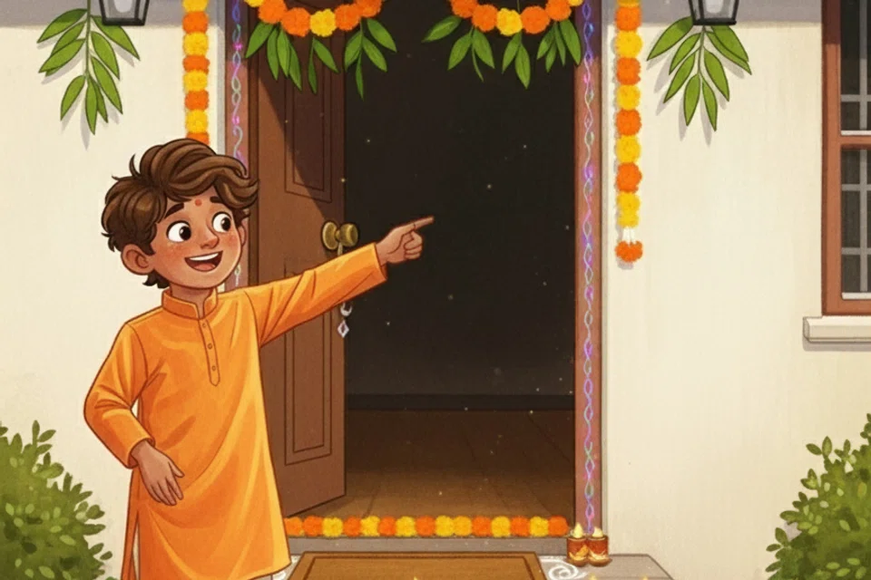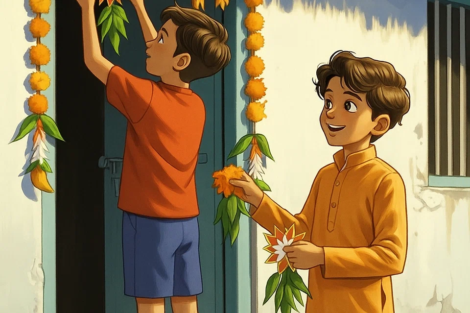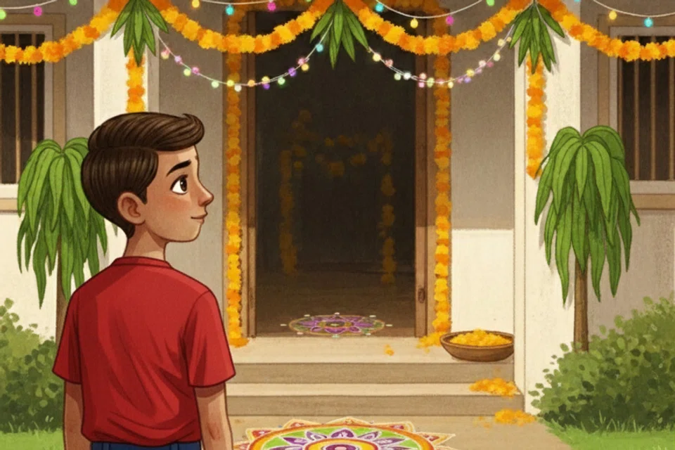 கண்ணனும் ரவியும் அண்டை வீட்டுக்காரர்கள். இருவரும் ஒரே பள்ளியில் படிக்கிறார்கள். ரவியும் கண்ணனும் தினமும் பள்ளிக்கு சேர்ந்தே செல்வார்கள். அன்று ஞாயிற்றுக்கிழமை என்பதால் கண்ணன் காலையில் எழுந்து ரவியைப் பார்க்க கிளம்பினான். என்ன ஆச்சரியம்! ரவியின் வீட்டு வாசலில் ரங்கோலி கோலத்துடன் வண்ண வண்ணத் தோரணங்களும், மின்னும் விளக்குகளும் வீட்டை அலங்கரித்தது.