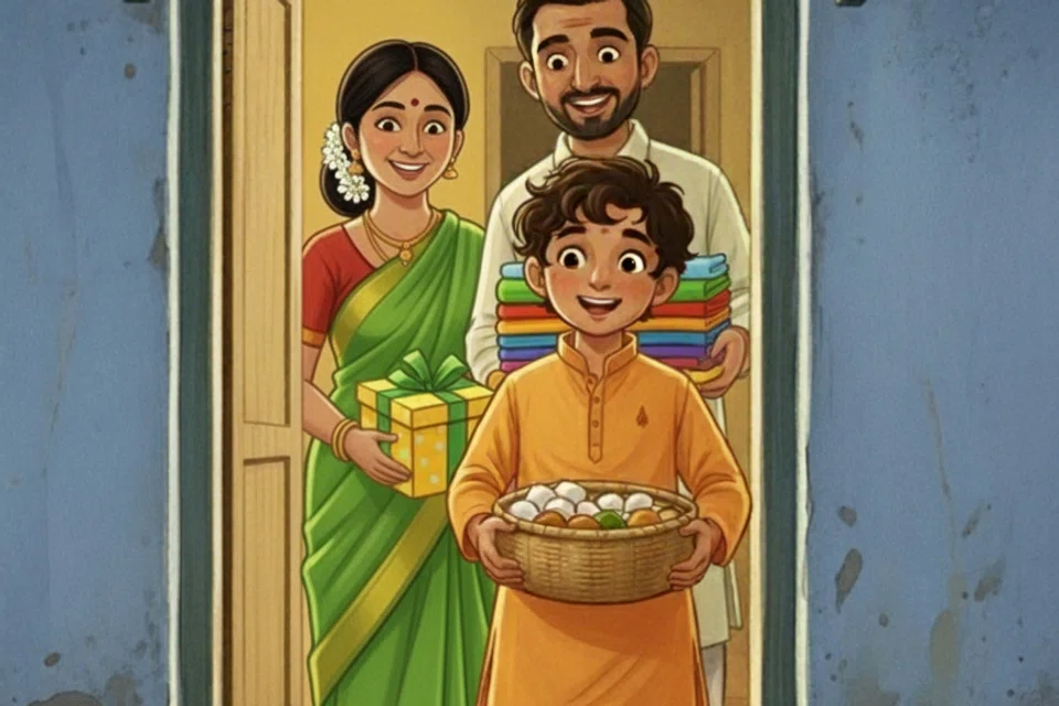 கண்ணனும் சிறுவன்தானே! அவனுக்கும் ஆசை இருக்கும் அல்லவா? அவன் அம்மாவிடம், “அம்மா! நாம் எந்தப் பலகாரமும் செய்யவில்லை. மேலும் புது உடையும் வாங்கவில்லை. பரவாயில்லை அம்மா. அப்பாவின் ஊதியம் நம் அன்றாடத் தேவைக்கே சரியாக இருக்கிறது,” என்று கூறிக்கொண்டு இருக்கும்போது வாசலில் ரவியும் அவன் பெற்றோரும் பரிசுப் பொருள்களுடன் நின்றிருந்தனர்.