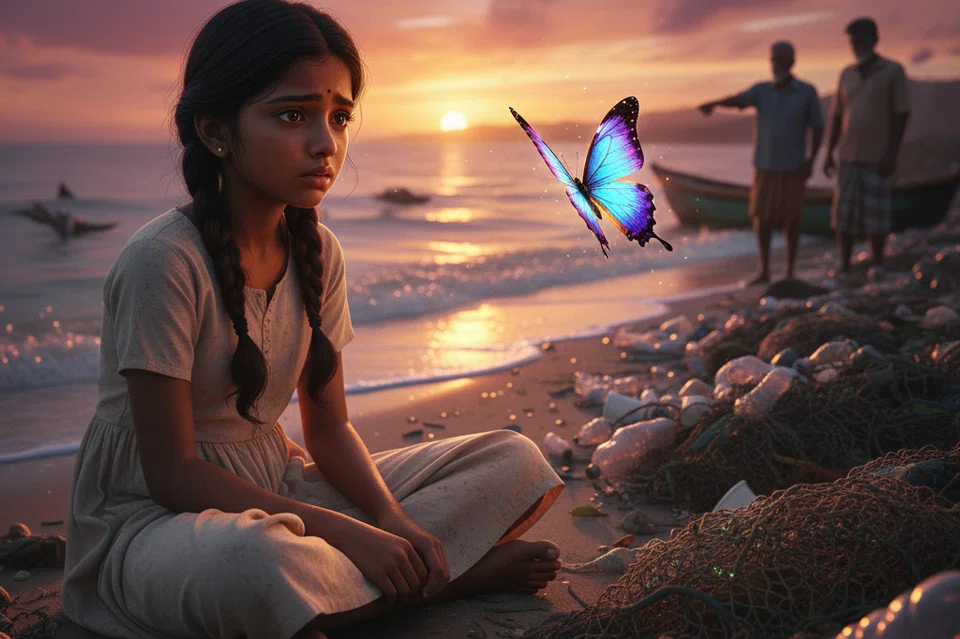 உயிரினங்கள் இறப்பதைப் பார்த்த சிறுமி கவிதா கவலையுடன் அமர்ந்திருந்தாள். அப்போது அவளை நோக்கிப் பறந்து வந்த வண்ணத்துப்பூச்சி, “கவி, ஏன் கவலையுடன் காணப்படுகிறாய்?” என்று கேட்டது. உடனே, கவி, அந்தக் கிருமிகளால் மீனவர்கள் படும் துன்பத்தைக் கூறினாள். அதைக் கேட்ட வண்ணத்துப்பூச்சி, “உனக்கு ஒன்று தெரியுமா? அவற்றுக்கு உணவே குப்பைதான். நீங்கள் அதிகமான குப்பைகளைக் கடலில் கலக்கிறீர்கள். அதிலிருந்து உருவான அந்தக் கிருமிகள் தற்பொழுது கரைக்கு வந்திருக்கின்றன. அவை விரைவில் இங்கு மக்கள் கொட்டி இருக்கும் குப்பைகளைத் தேடிச் சென்று அதில் வாழத் தொடங்கும்,” என்று கூறி மறைந்தது.