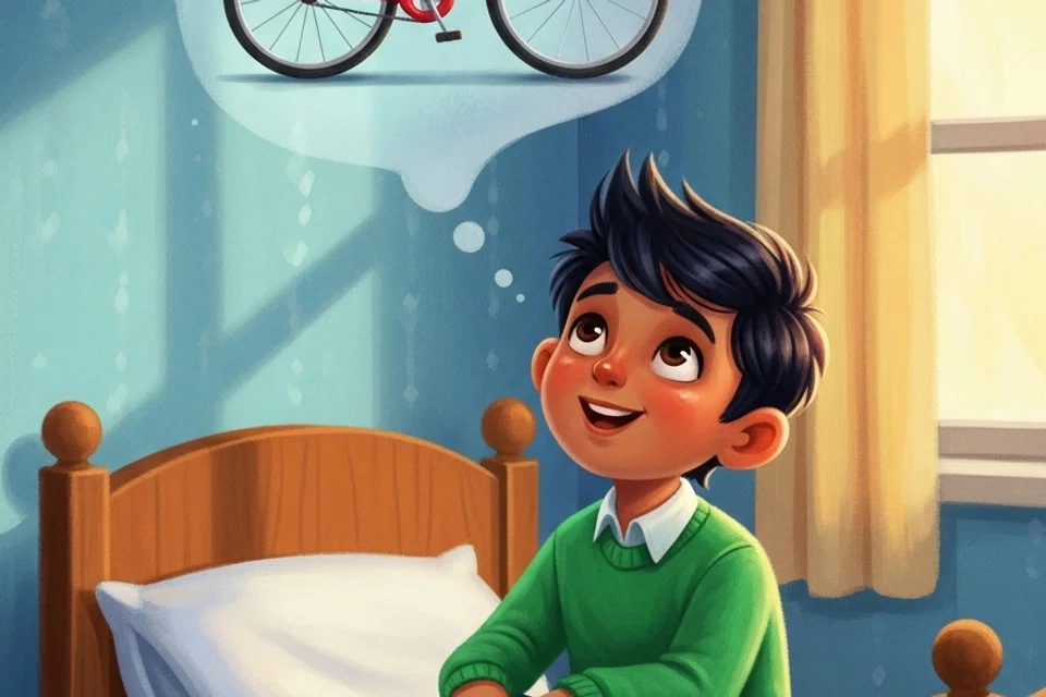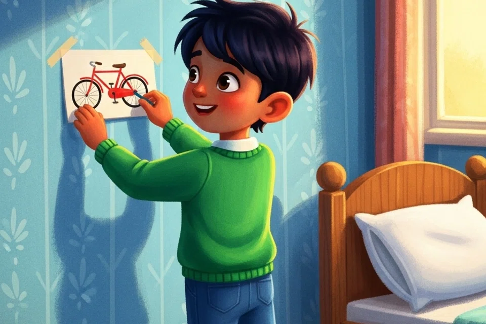 ஒருநாள் காகிதத்தில் அழகான சிவப்பு மிதிவண்டியை வரைந்தான். அதைத் தன் அறைச் சுவரில் ஒட்டி வைத்து அழகு பார்த்தான். அவனுடைய பெற்றோரிடம் அதைக் கேட்டு, தொந்தரவு பண்ண விரும்பாமல் தன் மனதிற்குள்ளேயே மிதிவண்டியை ஓட்டிச் செல்வதுபோல தினமும் நினைத்துக்கொண்டே தூங்கிவிடுவான்.