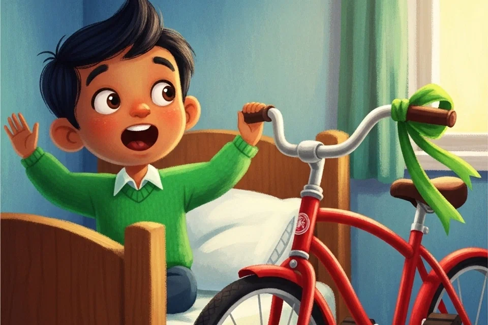 மறுநாள் காலை கிறிஸ்துமஸ் வந்தது. டேவிட் கண்விழித்துப் பார்த்தபோது, அவன் படுக்கைக்கு அருகில் அவன் ஆசைப்பட்ட அதே மின்னும் சிவப்பு மிதிவண்டி நின்றது! ‘கிறிஸ்துமஸ் தாத்தா வந்திருக்கிறார். அவர்தான் தனக்கு இந்த மிதிவண்டியைக் கொடுத்து இருக்கிறார்,’ என்று நினைத்து மகிழ்ச்சியில் திளைத்தான். அவனுடைய பெற்றோரும் மகிழ்ந்தனர்.