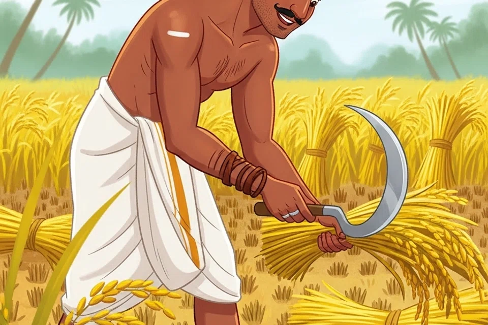 அறுவடை செய்யும் நாள் வந்தது. வேலன் ஒரு கூர்மையான அரிவாளை எடுத்துக்கொண்டு வயலில் இறங்கினார். அவர் ஒவ்வொரு கட்டாக நெற்கதிர்களை அறுவடை செய்து தரையில் அடுக்கினார்.