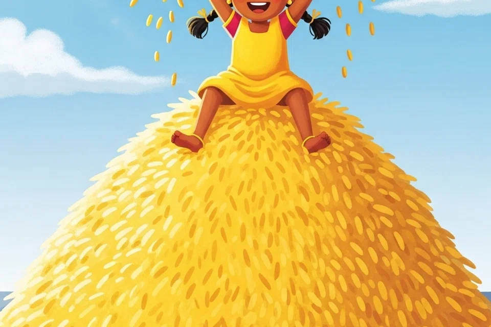 அறுவடை செய்த நெல்மணிகள் களத்திற்குக் கொண்டு வரப்பட்டு ஒரு சிறிய மலை போலக் குவிக்கப்பட்டன. குன்றுபோல் குவிந்து இருந்த நெல்மணியின் மேல் அமர்ந்து கயல் உற்சாகமாக விளையாடினாள்.