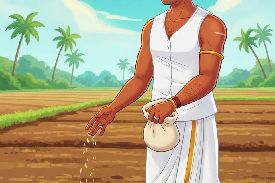 வேலன் என்ற விவசாயி தனது வயலில் நெல்மணிகளை விதைக்கத் தொடங்கினார். ‘இந்த விதைகள் வளர்ந்து, அமோக விளைச்சலைத் தரும்,’ என்று மகிழ்ச்சியுடன் இருந்தார்.