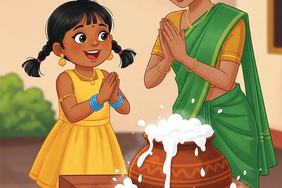 பானையில் இருந்த பால் நுரைத்து மேலே வந்தது. அப்போது கயலும் அவளது தாய் அமுதாவும், “பொங்கலோ பொங்கல்! பொங்கலோ பொங்கல்!” என்று உரக்கக் குரல் எழுப்பினர். பொங்கல் பானையிலிருந்து பால் வழிந்து ஓடியது.