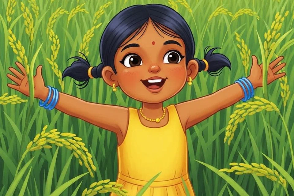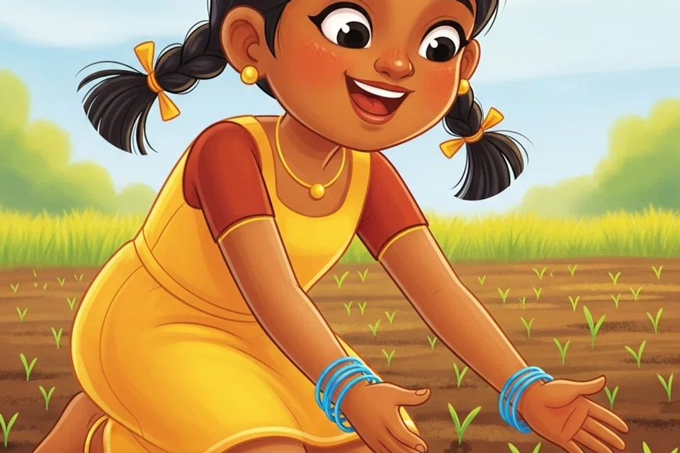 சில நாள்கள் கழித்து, கயல் தனது தந்தை வேலனுடன் வயலுக்கு வந்தாள். மண்ணிலிருந்து மிகச் சிறிய பச்சை நிறத் தளிர்கள் எட்டிப் பார்த்தன. “அப்பா, பாருங்கள்! குட்டிச் செடிகள் வந்துவிட்டன!” என்று கயல் துள்ளிக் குதித்து மகிழ்ந்தாள்.