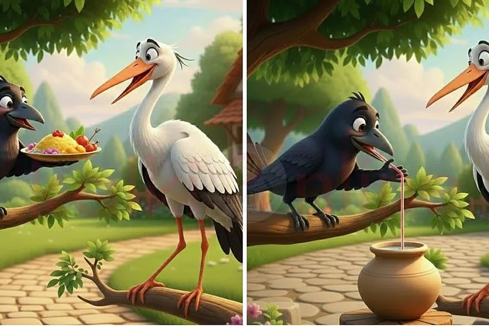 ஒரு நாள், கொக்கு தன் நண்பனான காகத்திற்கு மதிய விருந்து கொடுக்க ஆசைப்பட்டது. “நண்பா! இன்று என் வீட்டில் உனக்கு விருந்து, தவறாமல் வந்துவிடு!” என்று அழைத்தது. காகமும் மகிழ்ச்சியுடன் ஒப்புக்கொண்டது.