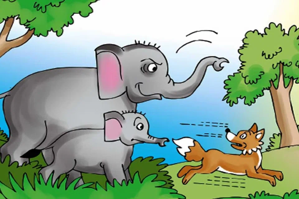 வழியில் குள்ளநரி ஒன்று எதிர்ப்பட்டது. குட்டி யானைக்கு ஆபத்து வந்து விடக் கூடாது என்பதற்காகக் குள்ளநரியைத் தாய் யானை விரட்டியடித்தது.