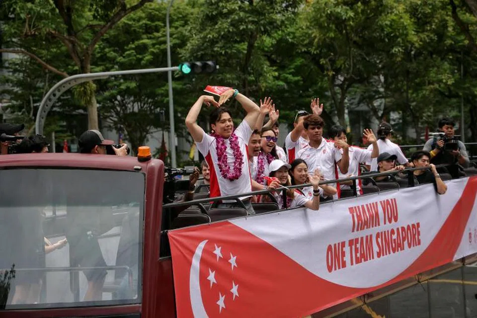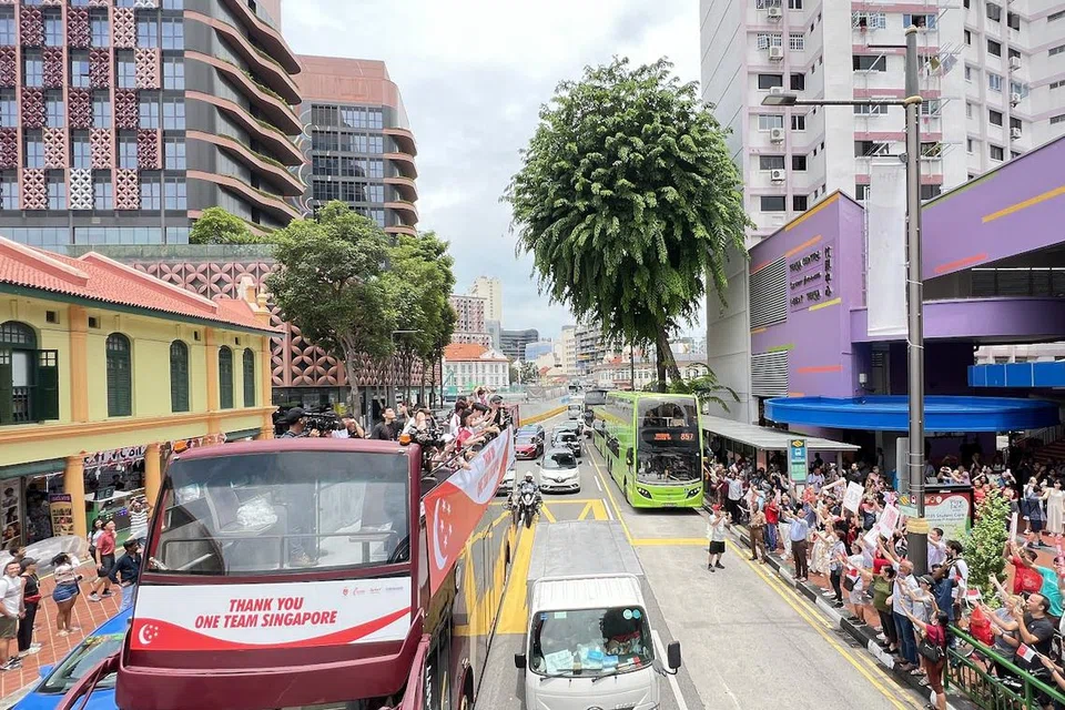 சிவப்பு நிறத் திறந்தவெளிப் பேருந்து, பத்து ‘டீம் சிங்கப்பூர்’ வீரர்கள், வீராங்கனைகளோடு காலை சுமார் 11.30 மணி அளவில் காலாங்கில் உள்ள சிங்கப்பூர் விளையாட்டு மையத்திலிருந்து புறப்பட்டுச் சென்றது.