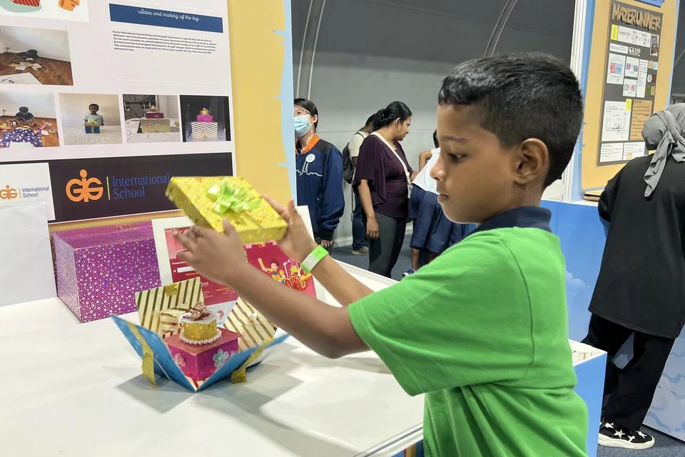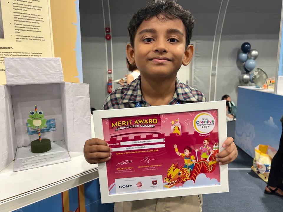 திறக்கும்போது தாவிக் குதிக்கும் பொம்மைக்காகப் பாராட்டு (Commendation) விருது வென்றார் ஜிஐஜி அனைத்துலகப் பள்ளி மாணவர் ஜானதன் வின்ஃப்ரட் பிரவீன், 8. - படம்: ரவி சிங்காரம்