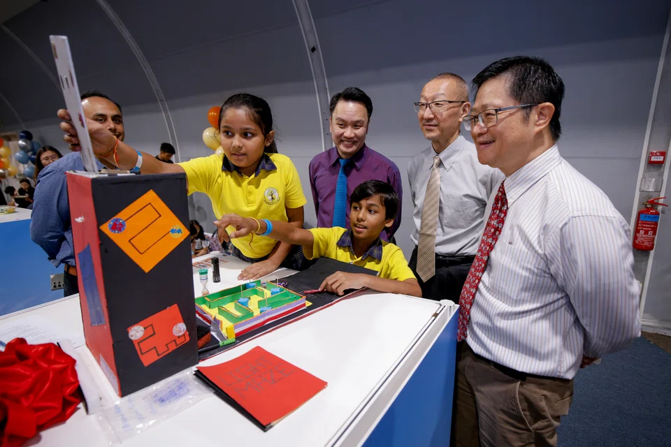 மாணவர்களுடன் இணைந்து விளையாட்டுப் பொருள் கண்காட்சியைத் திறந்து வைத்தார் கல்வி, மனிதவளத் துணை அமைச்சர் கான் சியாவ் ஹுவாங். - படம்: அறிவியல் நிலையம் சிங்கப்பூர்
