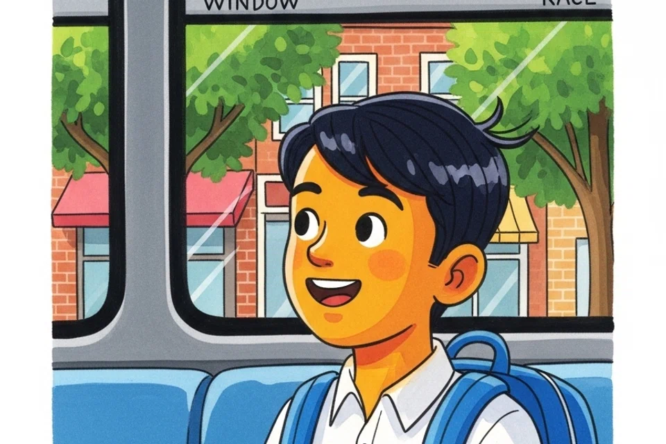 அன்றும் அவன் வழக்கம்போல் பேருந்தில் ஏறினான். அதிர்ஷ்டவசமாக அவனுக்குப் பிடித்த இருக்கை கிடைத்தது. குமார் மகிழ்ச்சியாக அமர்ந்து, வெளியே செல்லும் வண்டிகளையும் மரங்களையும் பார்த்து ரசித்துக்கொண்டே வந்தான்.
