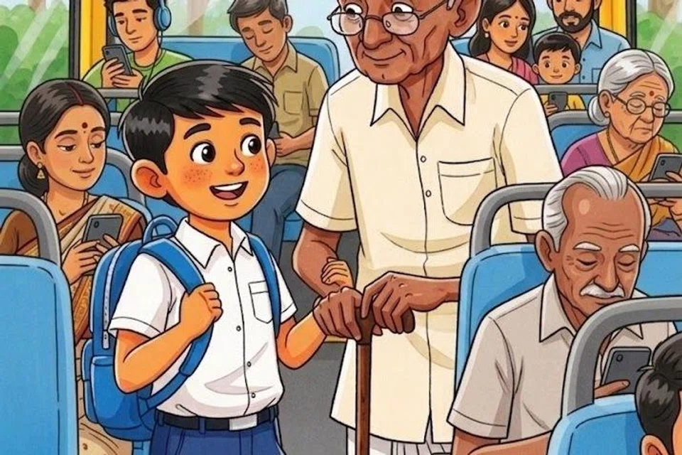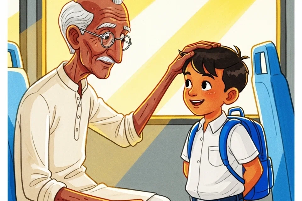 இதைக் கவனித்த குமார் சிறிதும் தயங்காமல் தன் இருக்கையிலிருந்து எழுந்தான். தாத்தாவின் கையைப் பிடித்து, “தாத்தா, என்னால் நிற்க முடியும். நீங்கள் வந்து என் இடத்தில் உட்காருங்கள்,” என்று அன்பாகக் கூறினான்.