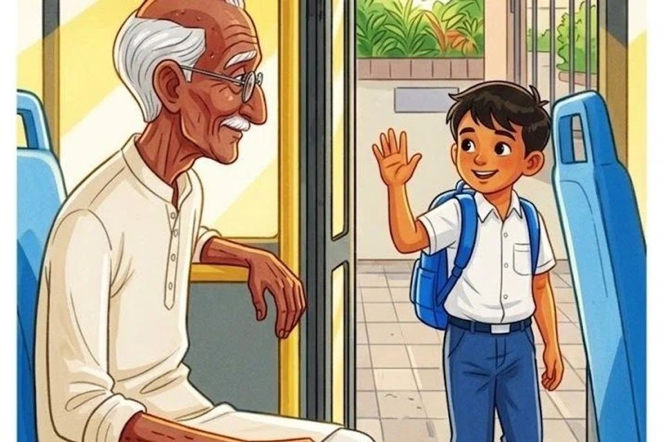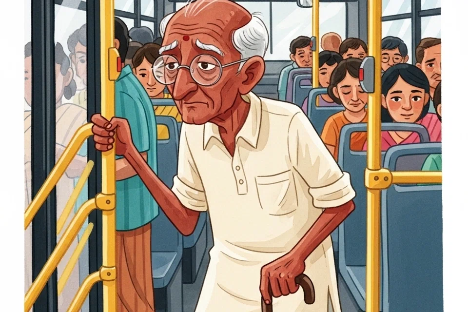 இரண்டு நிறுத்தங்கள் கடந்ததும், பேருந்தில் பலர் ஏறினர். அப்போது, கையில் ஓர் ஊன்றுகோலை ஊன்றியபடி மிகவும் வயதான தாத்தா ஒருவர் பேருந்தில் ஏறினார்.