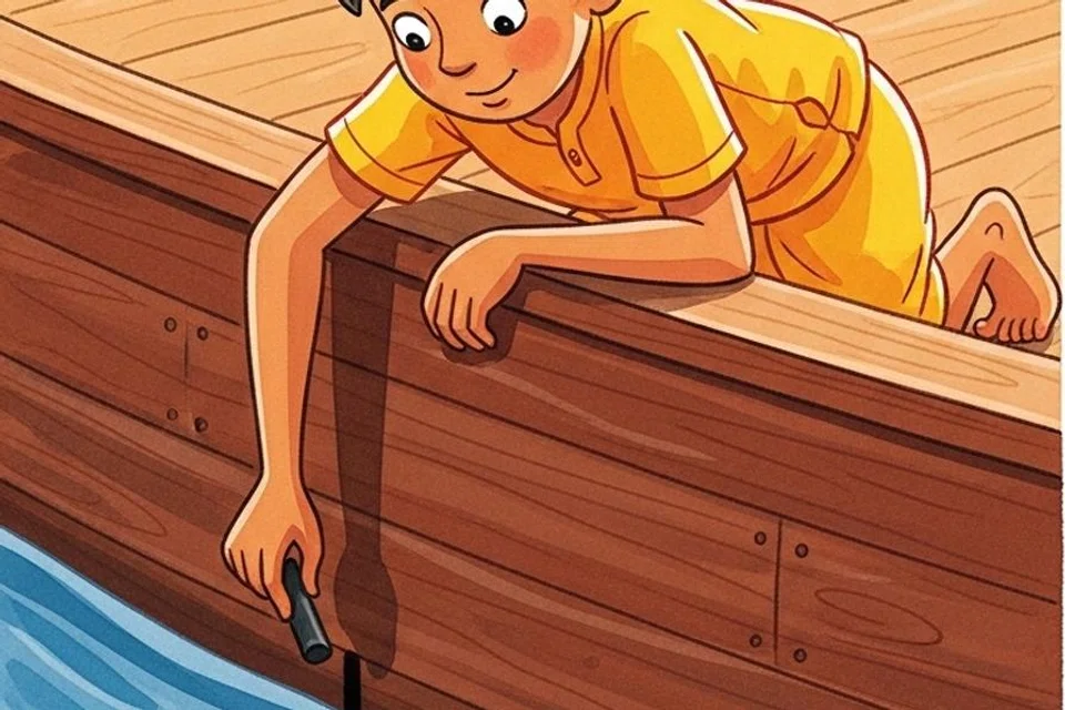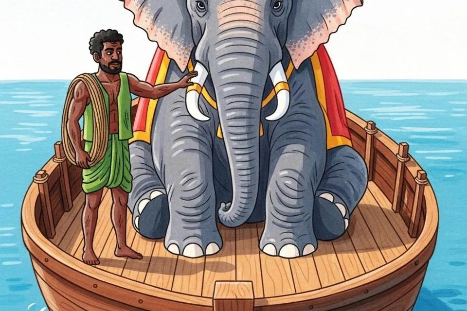 அரசர், தந்தை, யானை அனைவரையும் அழைத்துக்கொண்டு கடற்கரைக்குச் சென்றான் அறிவன். அங்கு இருந்து ஒரு பெரிய படகில் யானையை ஏற்றினான். யானையின் எடையால் படகு தண்ணீரில் அமிழ்ந்தது.