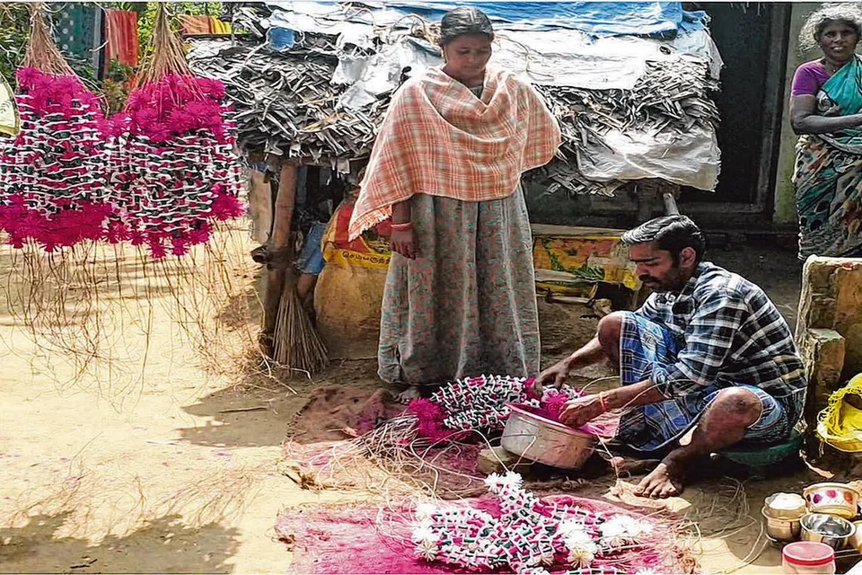 தங்களின் வீட்டுப் பின்பகுதியில் செல்வமும் அவரது மனைவியும் வேலையைத் தொடங்குவர். 1,000முதல் 3,000 மாலைகள்வரை இத்தம்பதியினர் ஒவ்வோர் ஆண்டும் தயாரிக்கின்றனர்.