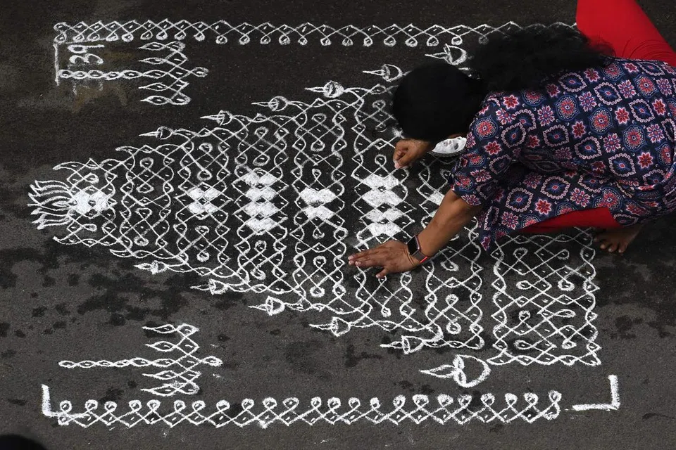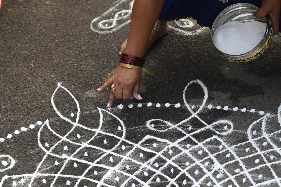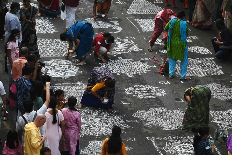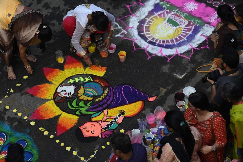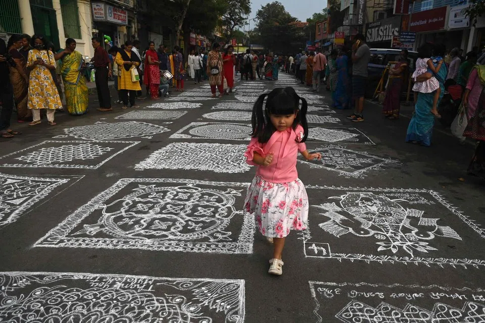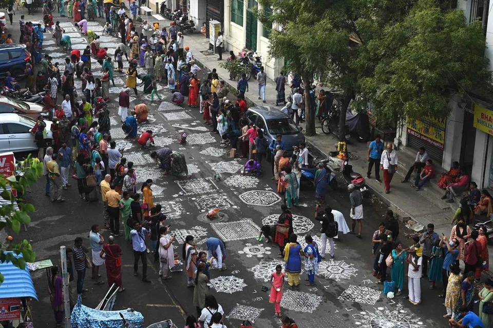 மயிலாப்பூர், சென்னை - பொங்கல் திருவிழாவை முன்னிட்டு தெருக்களை அலங்கரிக்கும் வண்ணம் மக்கள் பல நிறங்களில் மாக்கோலங்கள் இட்டு அழகுப் பார்த்தனர். படங்கள்: ஏஎஃப்பி -