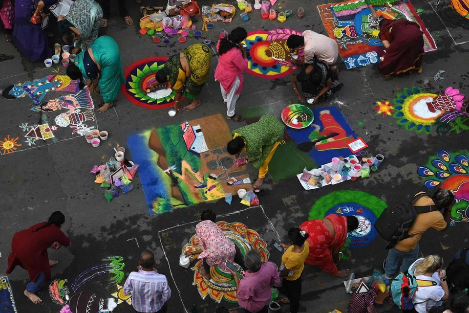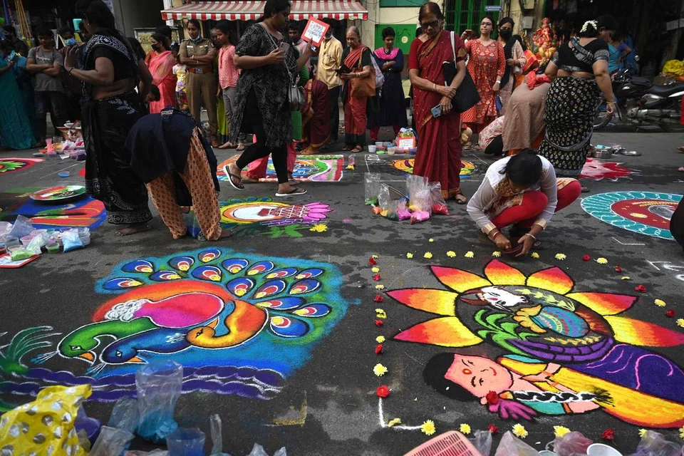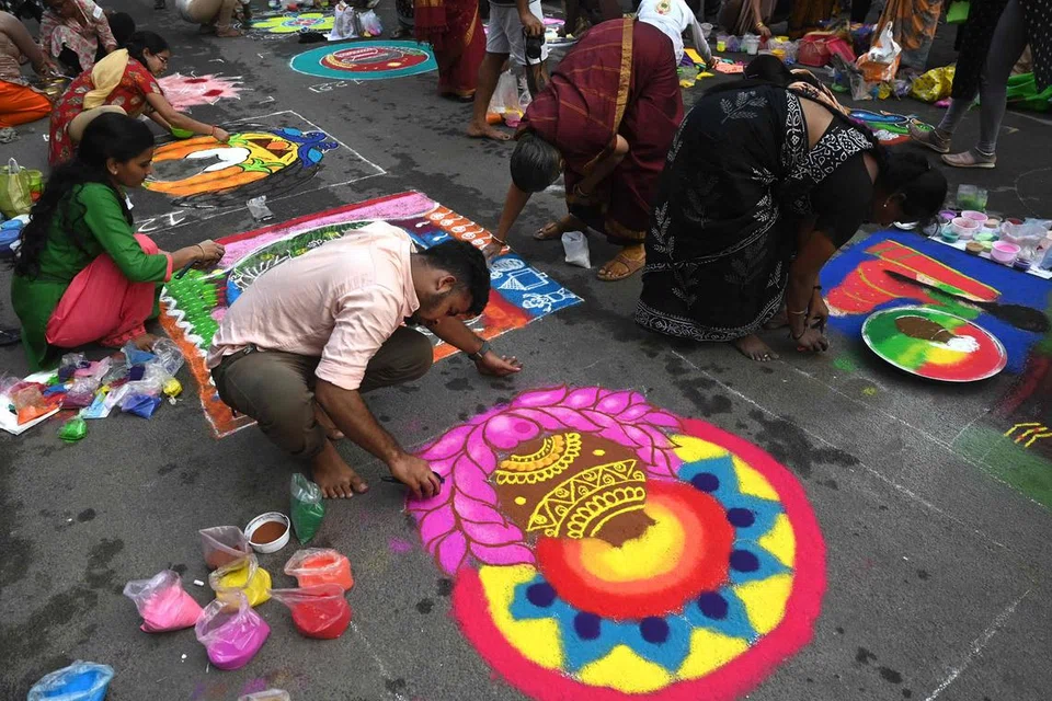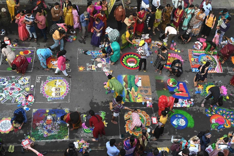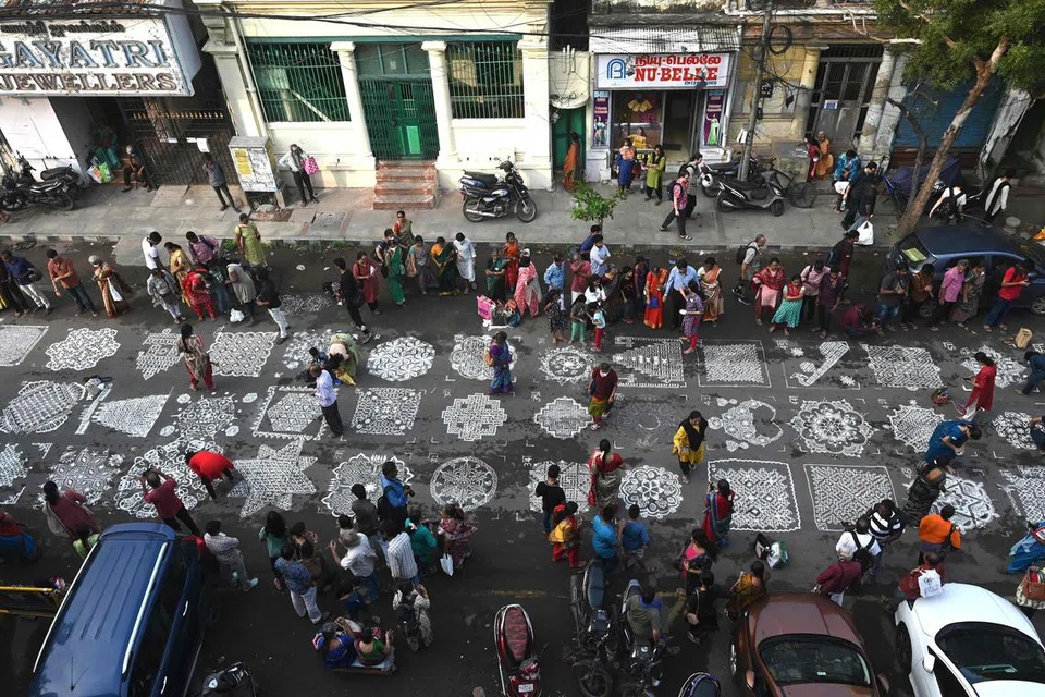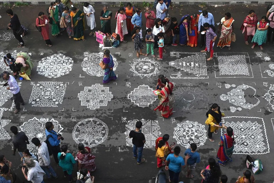 மயிலாப்பூர், சென்னை - பொங்கல் திருவிழாவை முன்னிட்டு தெருக்களை அலங்கரிக்கும் வண்ணம் மக்கள் பல நிறங்களில் மாக்கோலங்கள் இட்டு அழகுப் பார்த்தனர். படங்கள்: ஏஎஃப்பி -