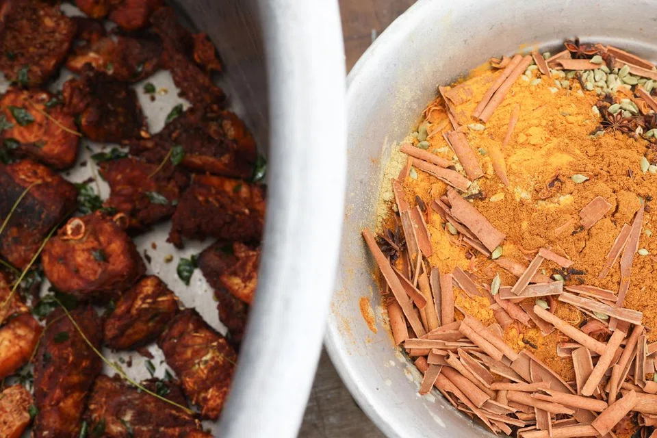 மசாலாவுடன் கிளறப்பட்ட மீன் துண்டுகள், பிறகு மீன் பிரியாணிக்காகப் பயன்படுத்தப்பட்டன. படம்: த.கவி -