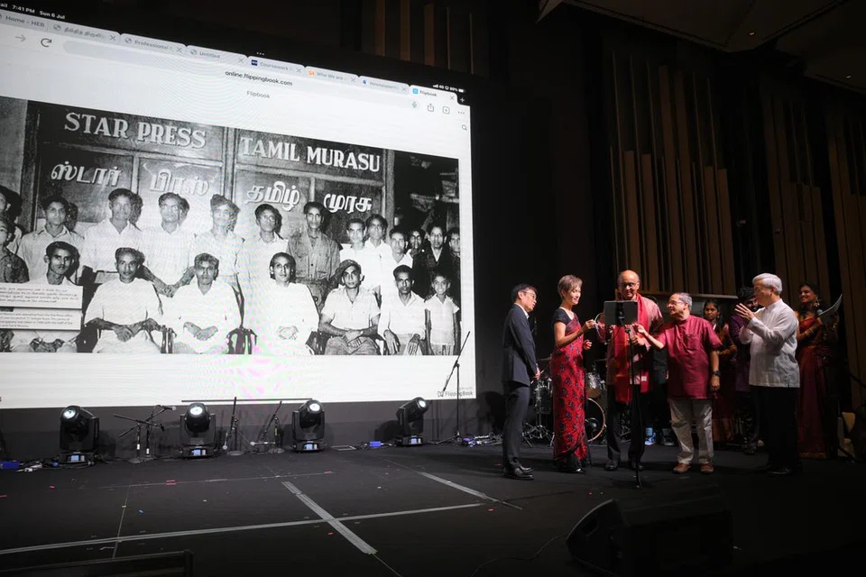 (வலமிருந்து) எஸ்பிஎச் நிறுவனத்தின் ஆங்கிலம், மலாய், தமிழ் ஊடகப் பிரிவின் முதன்மை ஆசிரியர் வோங் வெய் கோங், தகவல் மின்னிலக்க மேம்பாட்டு அமைச்சர் ஜோசஃபின் டியோ, அதிபர் தர்மன் சண்முகரத்னம், தமிழ் முரசு ஆசிரியர் த. ராஜசேகர் ஆகியோர், மேடை நிகழ்ச்சியில். பின்னணித் திரையில், எளிமையான அன்றையக் காலத்துப் பத்திரிகை ஊழியர்களின் புகைப்படம். - படம்: ஸ்ட்ரெய்ட்ஸ் டைம்ஸ்