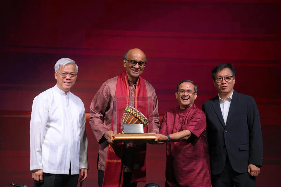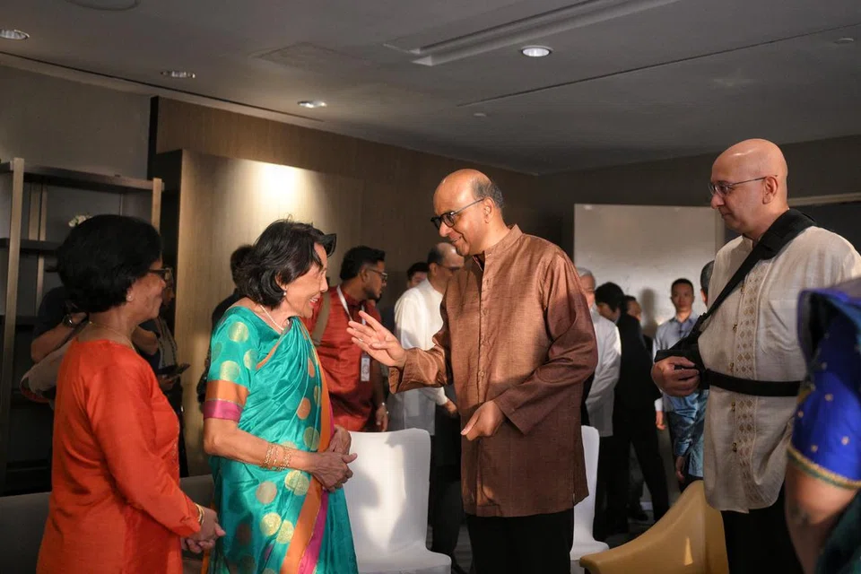 தமிழ் முரசின் நிறுவனர் கோ. சாரங்கபாணியின் மகள் திருவாட்டி ராஜம், முன்னாள் இதழாசிரியர் முருகையன் நிர்மலா ஆகியோருடன் அதிபர் தர்மன் சண்முகரத்னம் உறவாடுகிறார். - படம்: ஸ்ட்ரெய்ட்ஸ் டைம்ஸ்