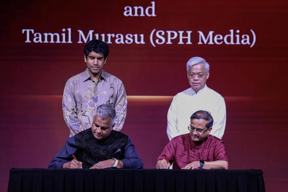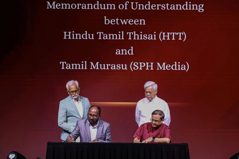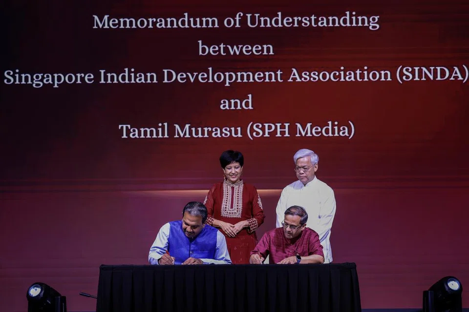 சிங்கப்பூர் இந்தியர் மேம்பாட்டுச் சங்கத்தின் தலைமை நிர்வாகி ரா. அன்பரசு, தமிழ் முரசு ஆசிரியர் த. ராஜசேகர் ஆகியோர் புரிந்துணர்வு ஒப்பந்தம் ஒன்றைக் கையெழுத்திடுகின்றனர். - படம்: சுந்தர நடராஜ்
