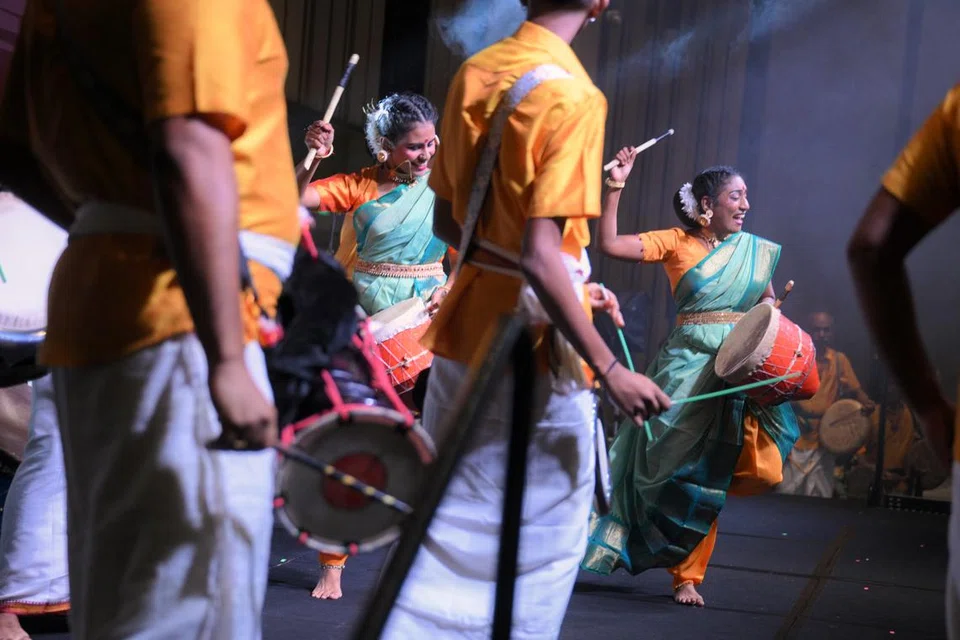 ஆட்டம் கலைக்குழுவினரின் மேள வாத்தியங்களுடன் கூடிய பாரம்பரிய நடனம். - படம்: ஸ்ட்ரெய்ட்ஸ் டைம்ஸ்