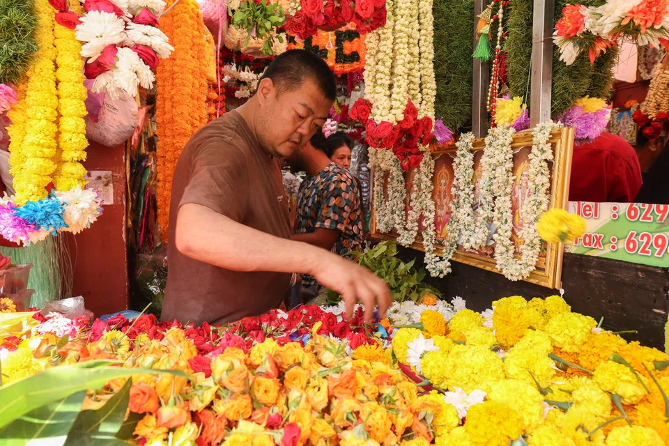 பூக்கடையில் விதவித வண்ண மலர்கள் விற்பனைக்கு. - படம்: த.கவி